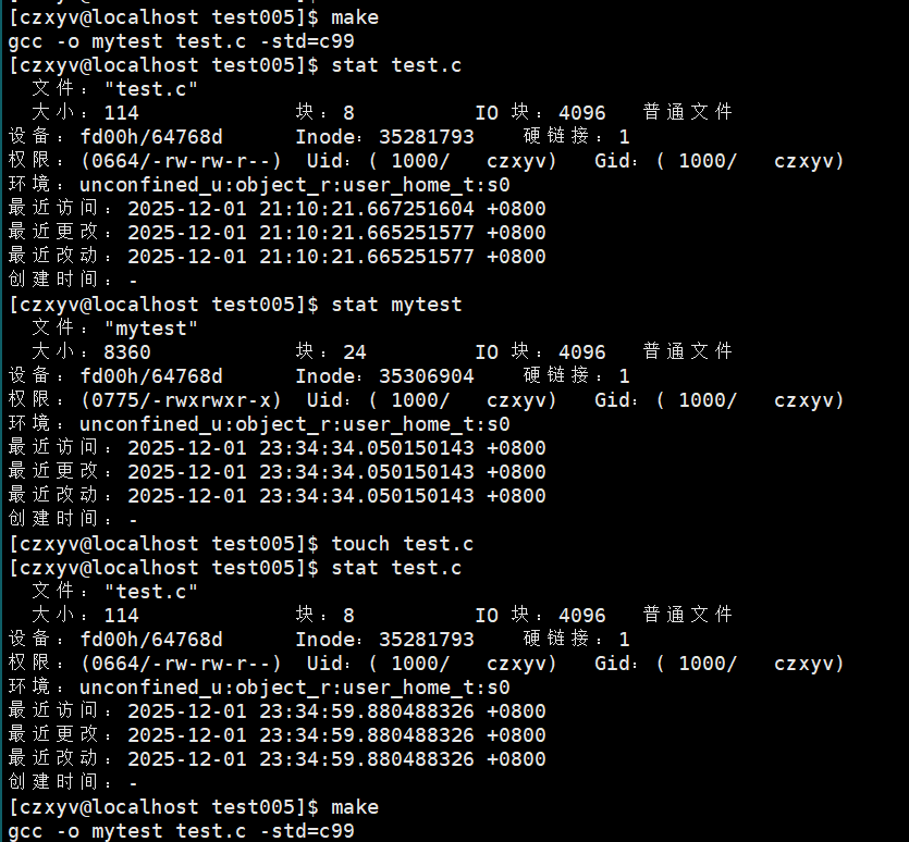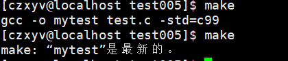 在上面操作中,没有修改test.c中的代码,只是用touch命令更新了test.c的修改时间,再执行make,我们可以发现make没有拦截。