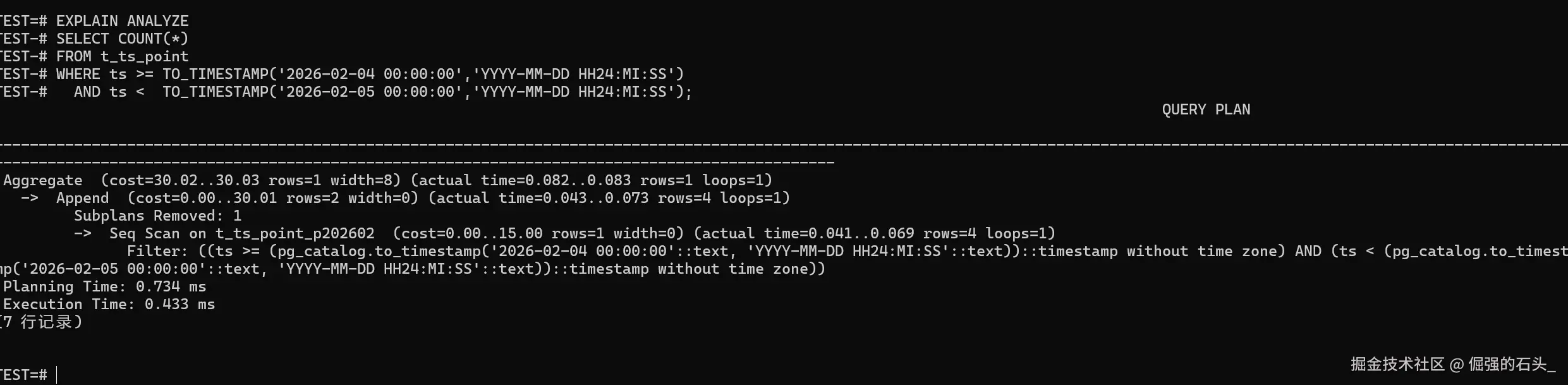 p202602,不要把p202603也带上; - 如果发现计划里还是全分区都扫,优先回头检查两件事:时间条件有没有写成可裁剪的形式;分区键是不是就是你过滤的那个字段(这里是