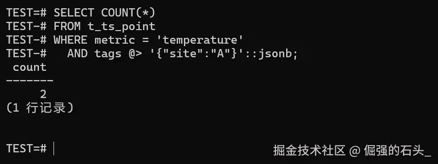 @>是"包含"语义,你筛{"site":"A"},返回的应该是 tags 里 site= A 的那批点;- 一旦 tags 维度开始变多,建议把"哪些维度进 tags、哪些维度做普通列"在盘点阶段就定死,不然后面很容易出现 tags 基数爆炸、查询越来越慢。