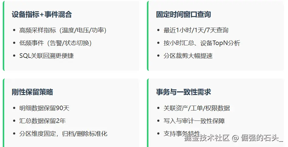 t_ts_point,保留 30~90 天; - 汇总层:按小时/天的汇总表(也是按时间分区),保留更久。