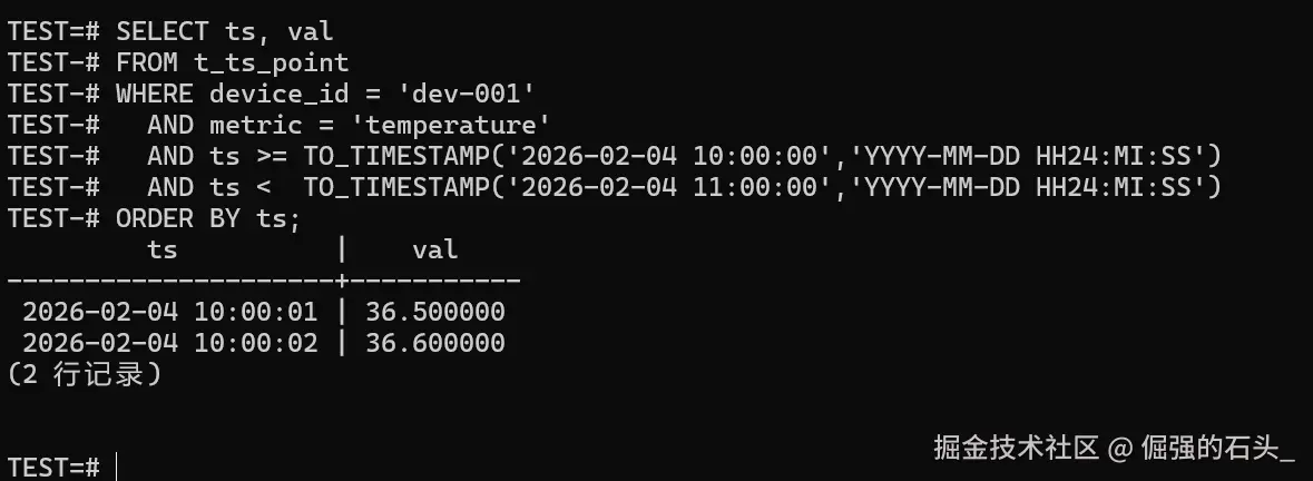 bucket是否按小时对齐(时间桶是不是你想要的粒度);avg/min/max是否符合直觉(哪怕是样例数据,也能快速判断有没有把字段写错、把 val 转型搞错);- 后续真正在生产跑的时候,这类聚合查询的性能主要靠"时间条件 + 分区裁剪",别只盯索引,分区没裁剪到位就是白搭。