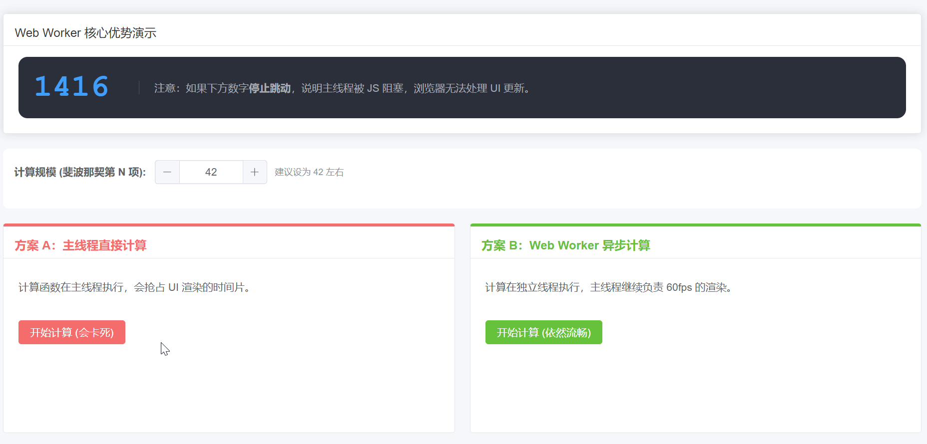 方案 B(Worker) :点击开始计算,后台在狂奔,但前台的帧率计数器 依然流畅跳动 ,Loading 动画丝滑旋转。用户体验满分!✅