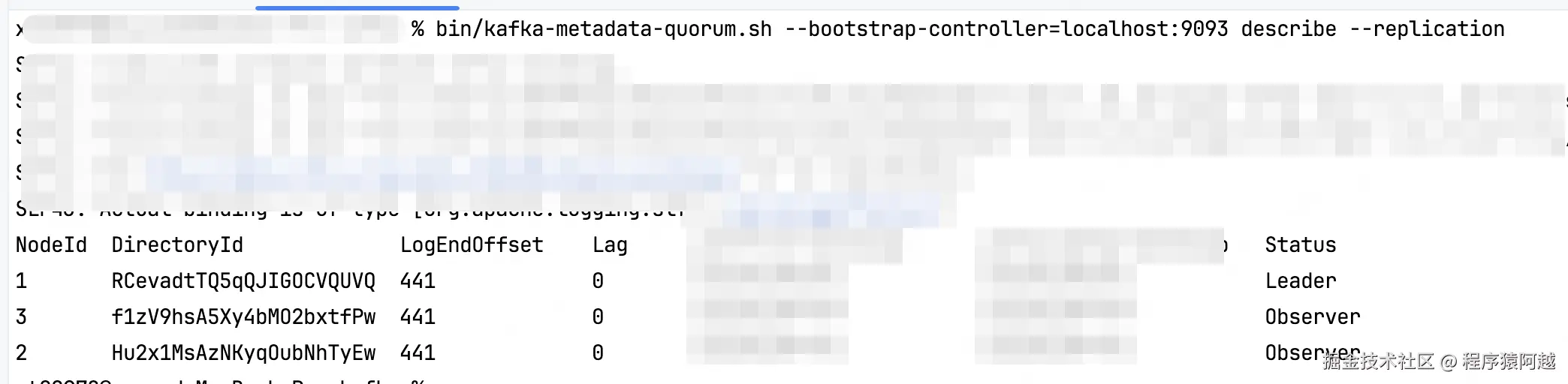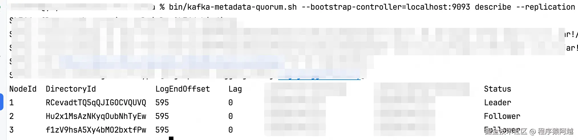 $ bin/kafka-metadata-quorum.sh --bootstrap-controller=localhost:9093 describe --replication
