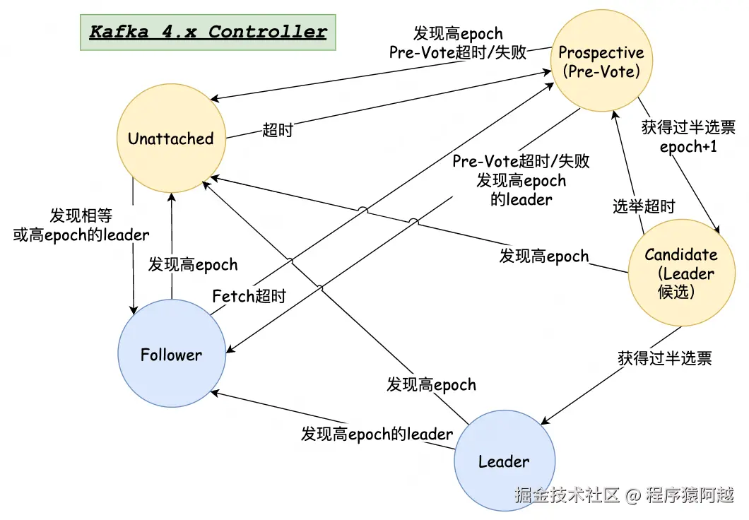 - Controller角色Follower,发现Fetch响应超时(controller.quorum.fetch.timeout.ms=2000ms),进入Prospective状态,准备参与选举;Leader发现过半Voter长时间未发送Fetch(3s),自行进入Resigned下线;