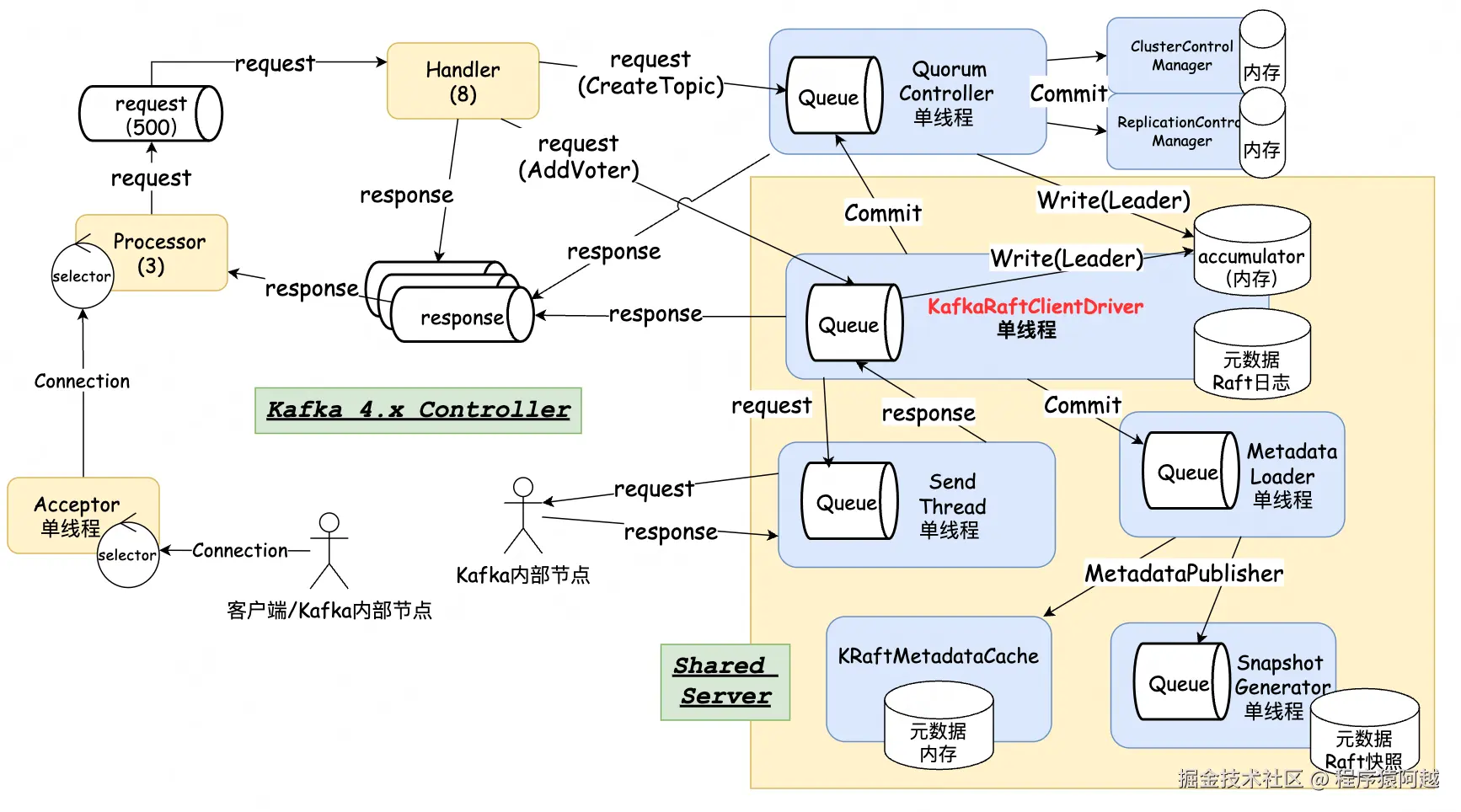 - Controller:在Voter集合中,可以参与Raft选举投票。如果选举通过成为Leader,称为Active Controller;否则成为Follower,称为Standby Controller,当发现Leader线下可以重新参与选举;