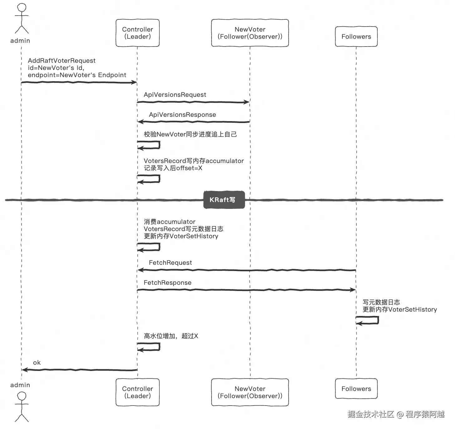 - admin通过kafka-metadata-quorum.sh将追上Leader的Controller角色Follower节点,加入Voter集合,使之成为Standby Controller;