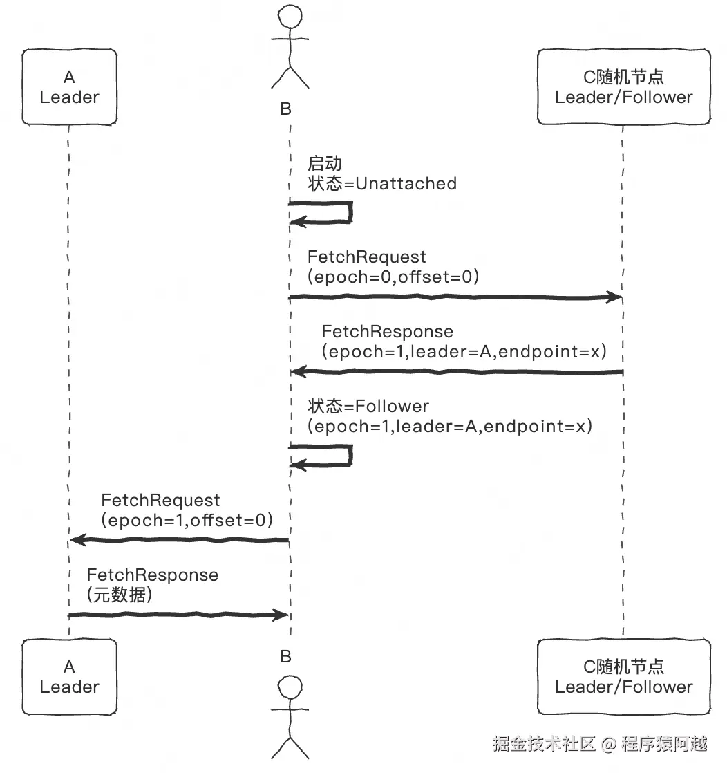 - 其他节点向controller.quorum.bootstrap.servers随机节点发送Fetch请求,发现Leader,自动成为Follower,开始复制数据;