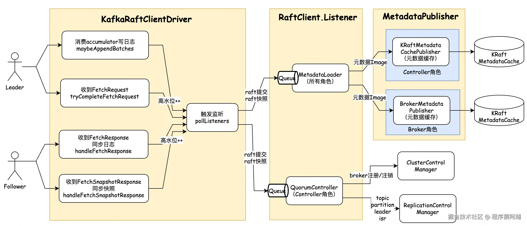 当HW变化,所有Raft成员通过MetadataLoader作为Listener读取新增Raft日志,构造增量和全量元数据Image,通过MetadataPublisher将元数据更新到内存;