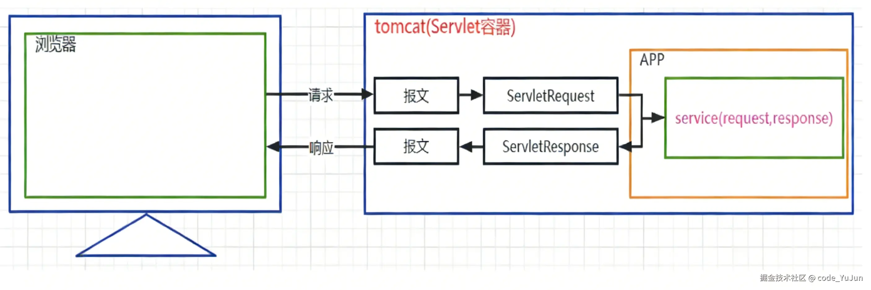 service方法,同时将HttpServletRequest和HttpServletResponse对象传入。
