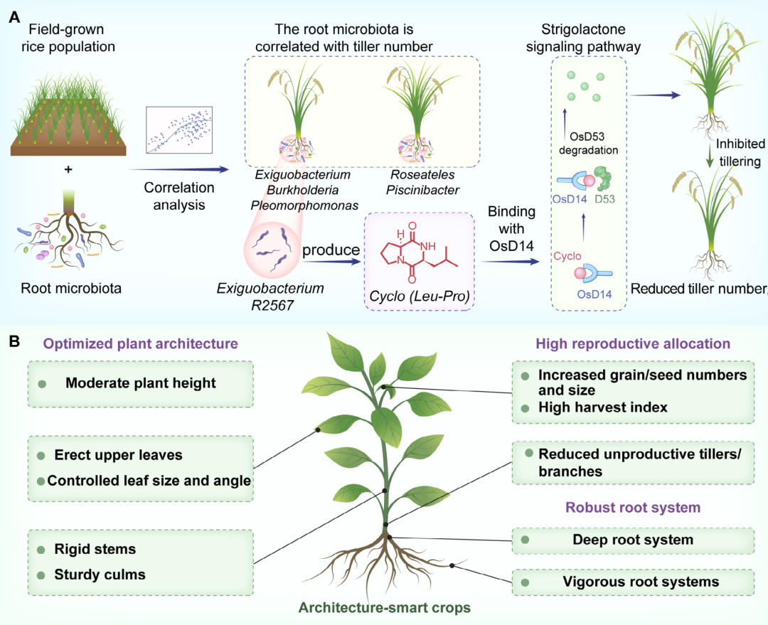 (A)根际微生物调控水稻分蘖数。对田间种植水稻群体中分蘖数与根际微生物组之间关联性的分析表明,Roseateles R780和Piscinibacter R1801可增加分蘖数,而Exiguobacterium R2567则降低分蘖数。Exiguobacterium R2567产生的Cyclo(Leu-Pro)通过与独脚金内酯受体OsD14复合物结合,促进独脚金内酯信号通路抑制因子OsD53的降解,从而调控水稻分蘖。(B)植物微生物组在构建"理想株型作物"中的潜力。所谓理想株型作物,其特征包括优化的地上部结构、较高的生殖分配比例以及健壮的根系系统。植物微生物组在促进这些理想性状形成过程中发挥关键作用,从而推动理想株型作物的培育与发展。