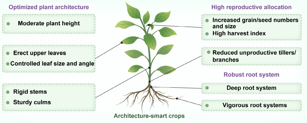 根际微生物群落影响植物的生长与发育,并在维持植物健康和增强环境胁迫耐受性方面发挥重要作用。根系相关微生物可通过协同调控宿主免疫反应和根际群落结构,诱导植物对病原物的抗性。值得注意的是,根际微生物组常被称为植物的"第二基因组"。现有研究大多聚焦于根际微生物在作物生长和抗逆中的作用机制,例如促进养分获取、合成植物激素以及增强根系发育等。然而,我们对于根际微生物如何影响作物株型及关键产量构成性状的认识仍然有限。近期研究发现,根际微生物可直接调控水稻分蘖数,而分蘖数是决定作物株型并显著影响产量的关键性状。这一新证据挑战了将作物株型视为由遗传因素静态决定、以优化产量和形态性状为目标的传统观点。我们认为,遗传定义的作物株型只是一个静态框架,其完整的适应潜力需要通过动态的微生物调控才能得以实现。基于此,我们进一步强调"全生物体株型(holobiont architecture)"的概念,即通过对根际微生物组的精准调控,实现表型可塑性与精细调节,从而培育"理想株型作物(architecture-smart crops)"。本观点围绕这一假设展开,系统梳理微生物参与株型调控的相关证据,并强调整合微生物与植物株型调控机制的研究路线图,以推动可持续农业的发展