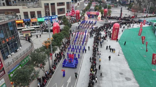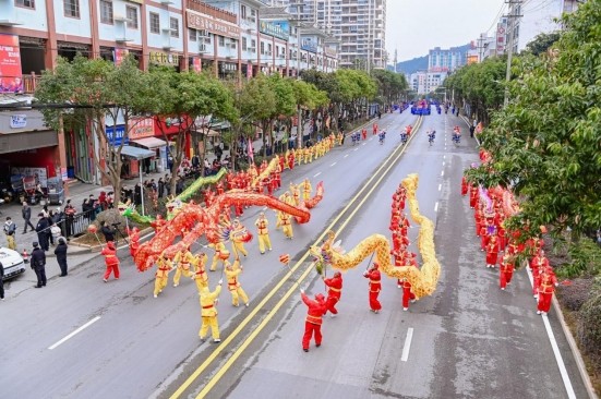 巡游队伍中,民族文化与时代精神交相辉映。松山街道城墙脚村的舞龙表演气势如虹,紫云职校引进的广州南沙百年非遗------黄阁麒麟舞首次在县庆舞台精彩呈现。彩龙翻腾、麒麟跃动,东西部协作的深情厚谊在传统与现代的交融中焕发新的生机。