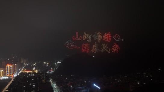 夜幕降临,无人机编队飞行表演点亮紫云夜空。千架无人机以天为幕、以光为笔,变幻出"紫气祥云60载""我爱紫云""铸牢中华民族共同体意识"等图案,传统与现代交融、文化与发展互促,为紫云六十华诞献上璀璨礼赞。
