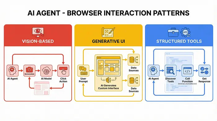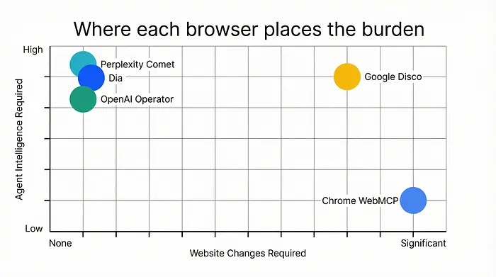 Chrome + WebMCP 是最新的进入者,并且在结构上最不同。它不构建一个更智能的代理来导航现有网站,而是提议更改网站本身。给页面一种声明其能力的方式,代理可以完全跳过导航。