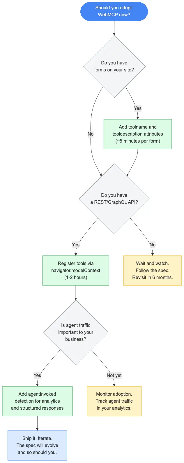 并且不要假设 WebMCP 采用会很快。当涉及到新标准时,网络移动缓慢,这通常是一个功能,而不是一个错误。