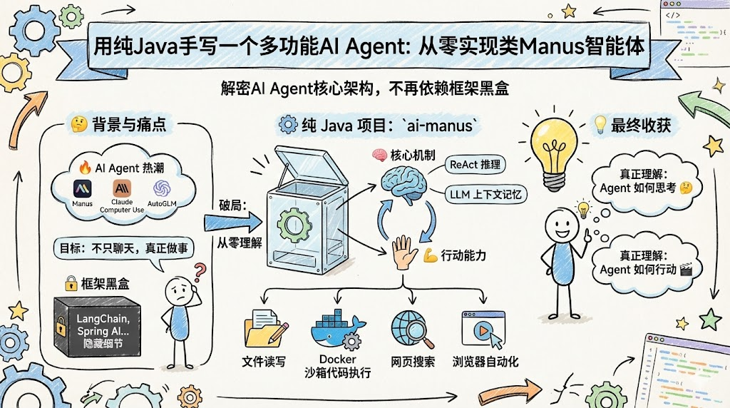 本文将通过一个完全不依赖Spring框架 的纯Java项目------ai-manus,带你从零理解AI Agent的核心架构。这个项目实现了一个功能完整的多工具智能体,具备文件读写、Docker沙箱代码执行、网页搜索、浏览器自动化等能力,并采用了ReAct(Reasoning + Acting)推理模式和LLM驱动的上下文记忆管理。通过逐层拆解其代码实现,你将真正理解一个AI Agent是如何"思考"和"行动"的。