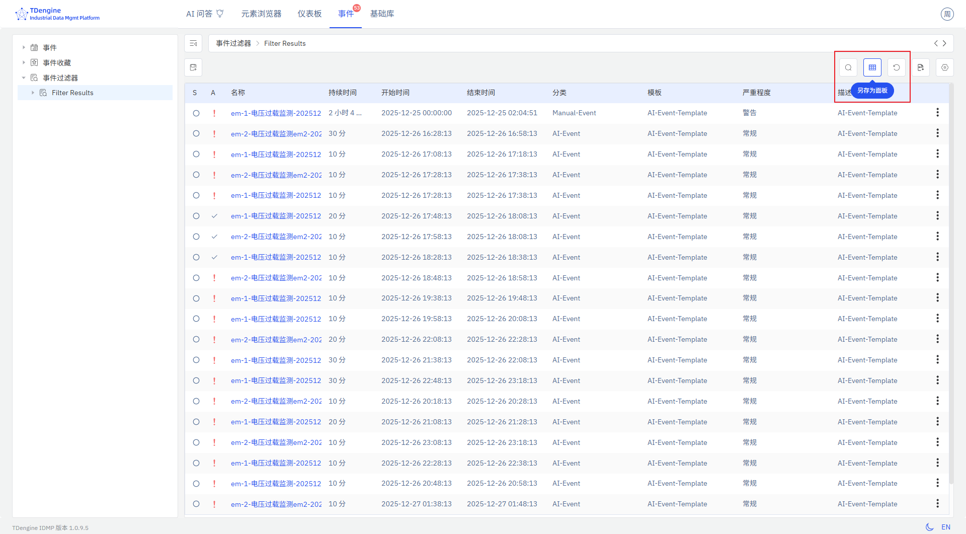 配置好查询条件,选择要显示的列后,可以点击"另存为面板"按钮,将当前的查询结果保存为事件列表面板。事件列表保存成功后,立即自动打开面板预览页面。也可以进入到保存元素的"面板"标签页,查看新保存的事件列表面板。