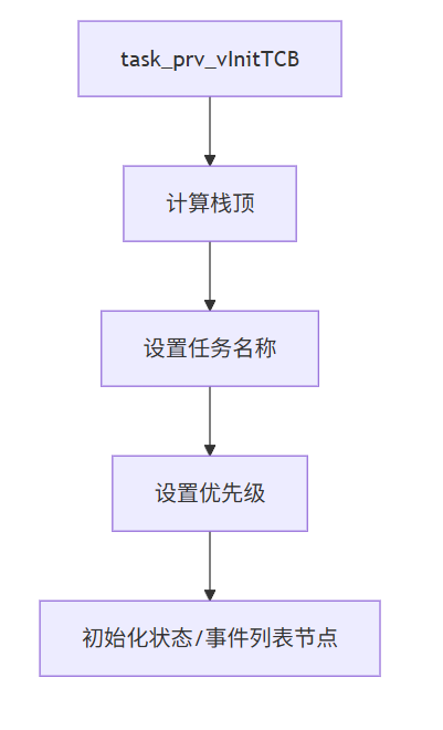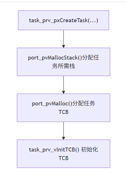 关键 :调用内部私有函数 task_prv_pxCreateTask 来: • 分配 TCB 内存 • 分配任务栈内存 • 初始化 TCB 字段(如任务名、优先级、栈指针等) • 设置初始 CPU 上下文(如寄存器状态) • 若 ppCreatedTask 非 NULL,则将 TCB 地址写入 *ppCreatedTask ✅ 成功时返回 TCB 指针;❌ 失败时返回 NULL |