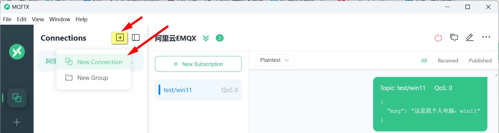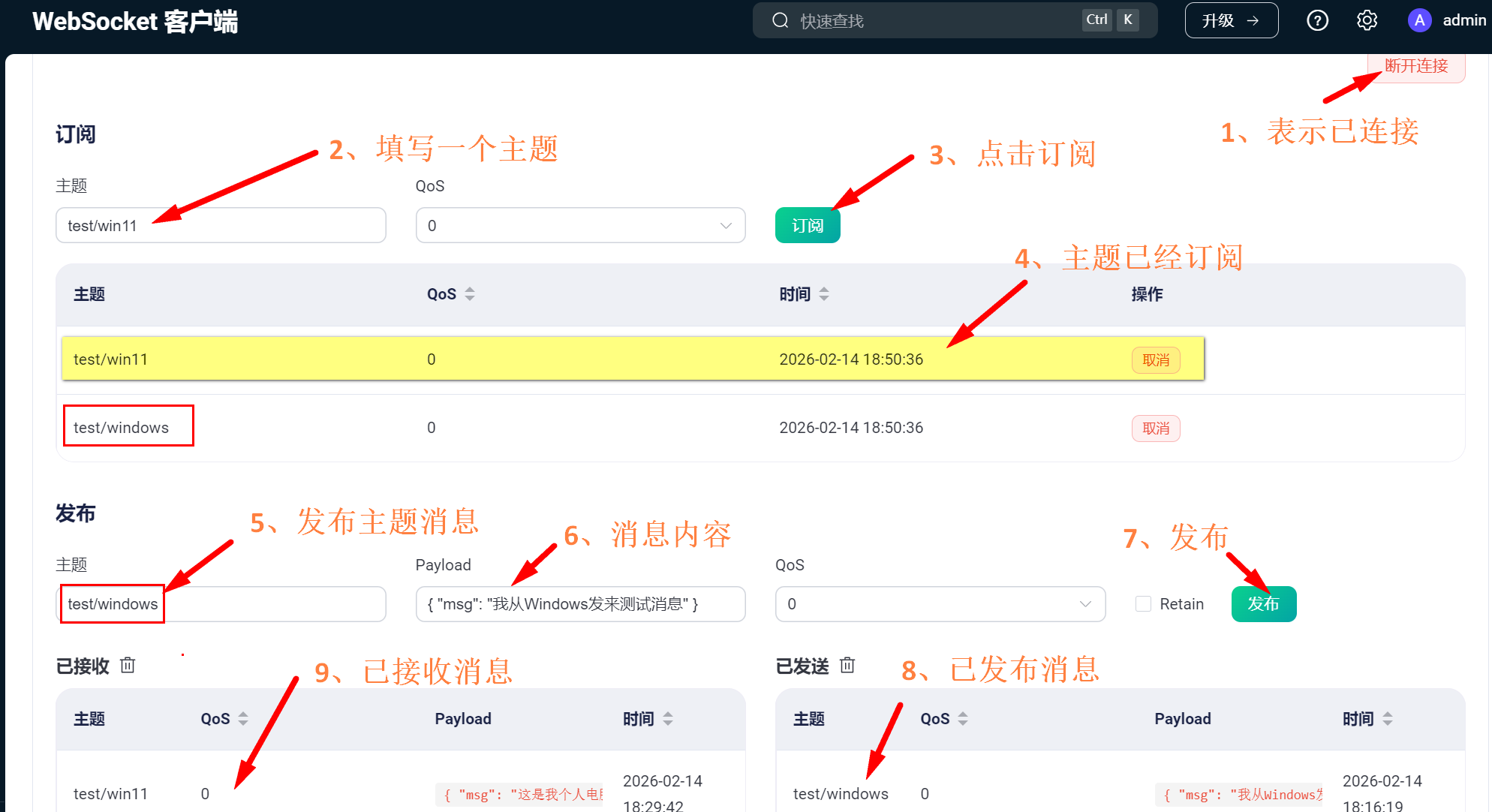1、订阅一个主题,主题可自行定义,上图中订阅了两个主题:"test/windows"和"test/win11"