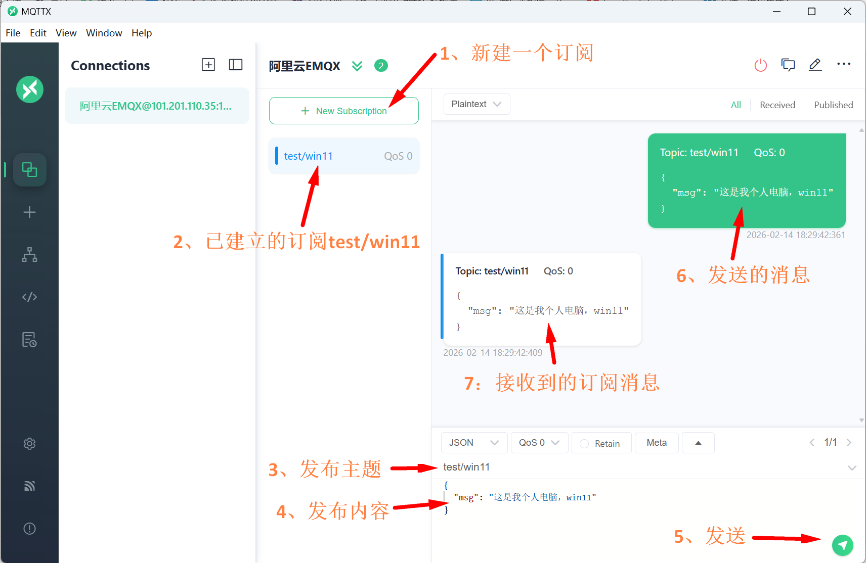 发布"test/win11"消息,同时可以看到接收到这个的订阅消息。