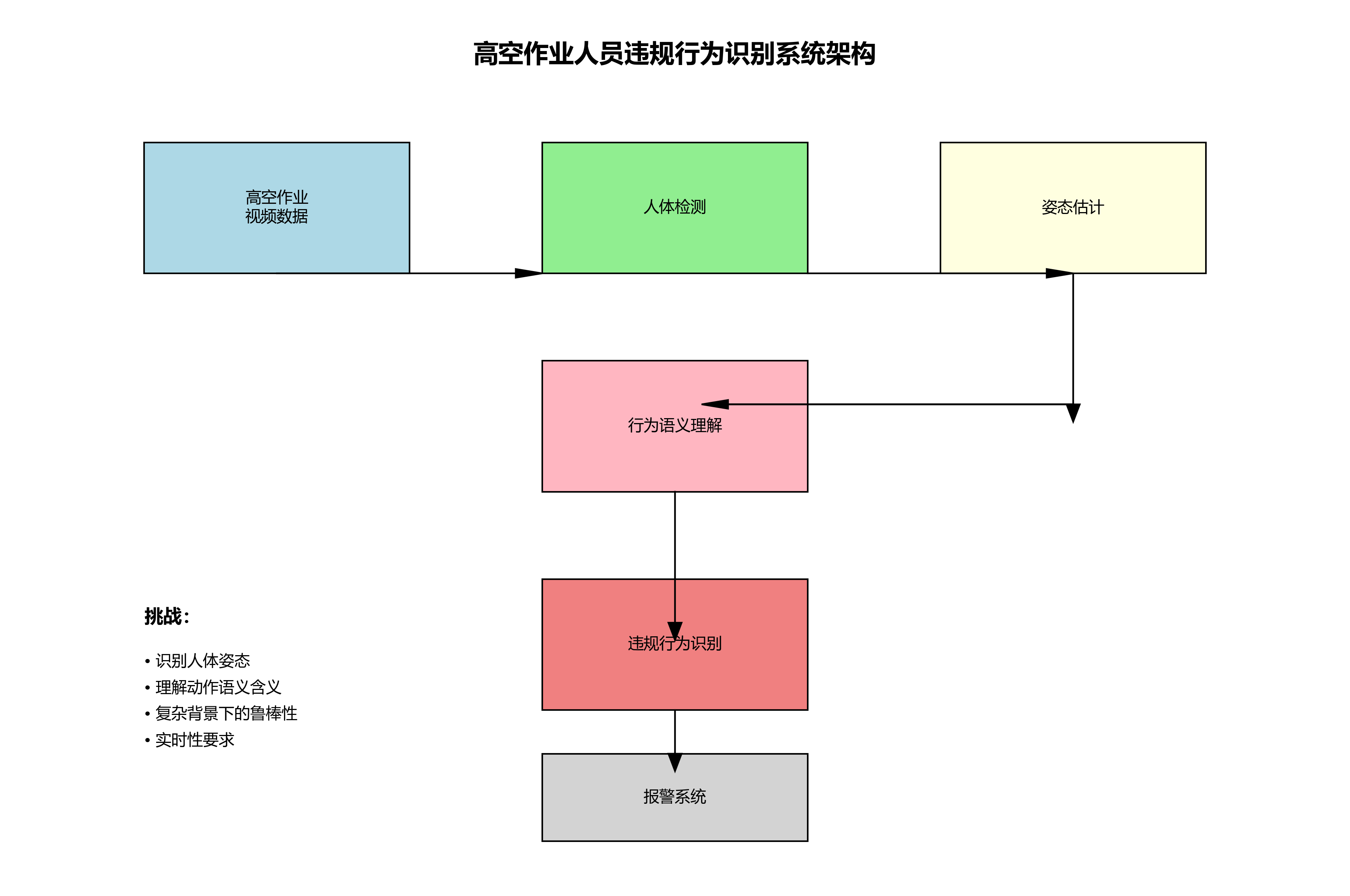 在完成安全装备检测的基础上,系统进一步对高空作业人员的违规行为进行识别。违规行为识别是一个更具挑战性的任务,因为它不仅需要识别人体姿态,还需要理解人体动作的语义含义。