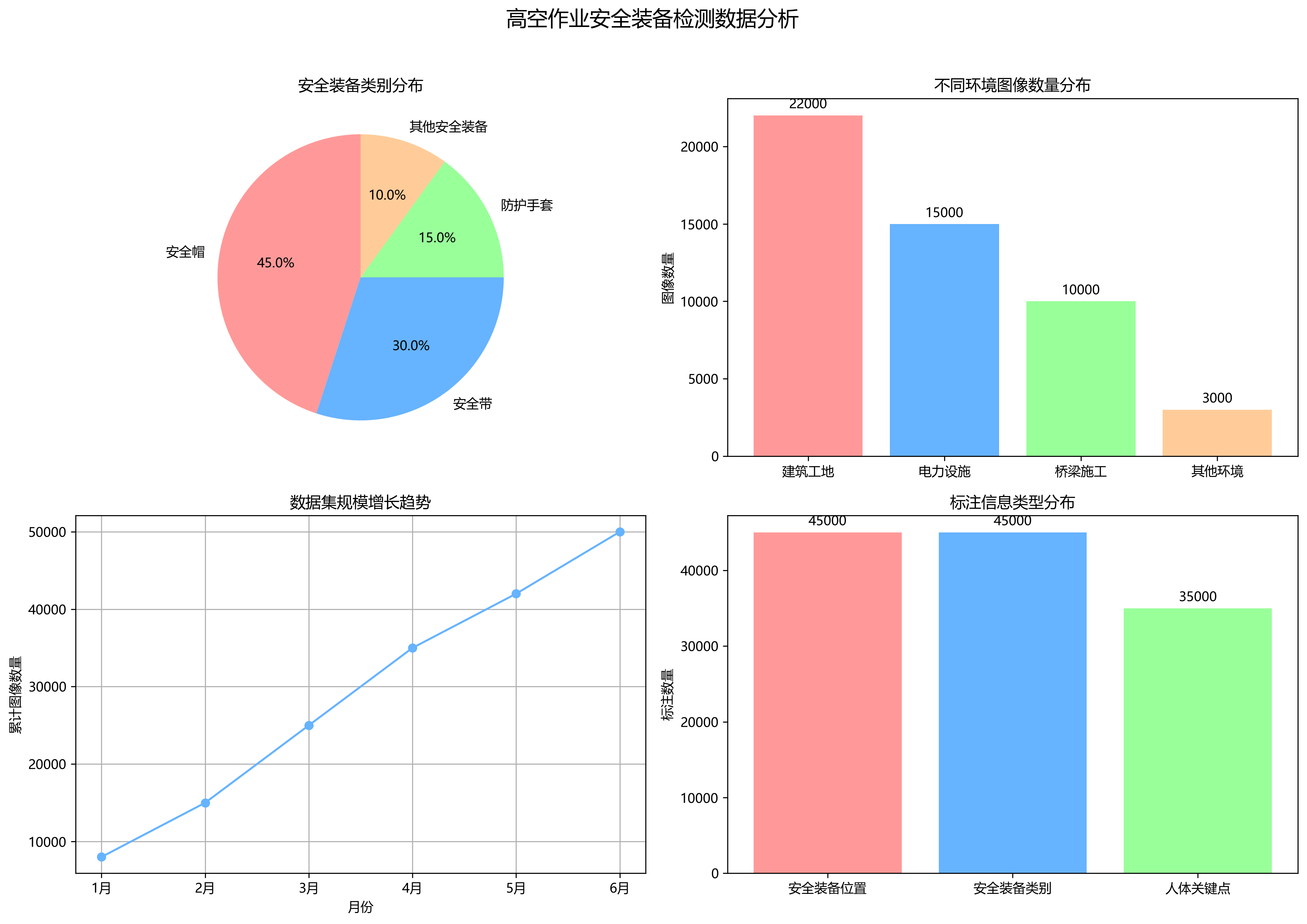 为了训练安全装备检测模型,我们构建了一个包含高空作业场景的图像数据集,涵盖不同光照条件、不同作业环境下的安全装备图像。数据集包含约50,000张标注图像,涵盖安全帽、安全带、防护眼镜等6类安全装备。