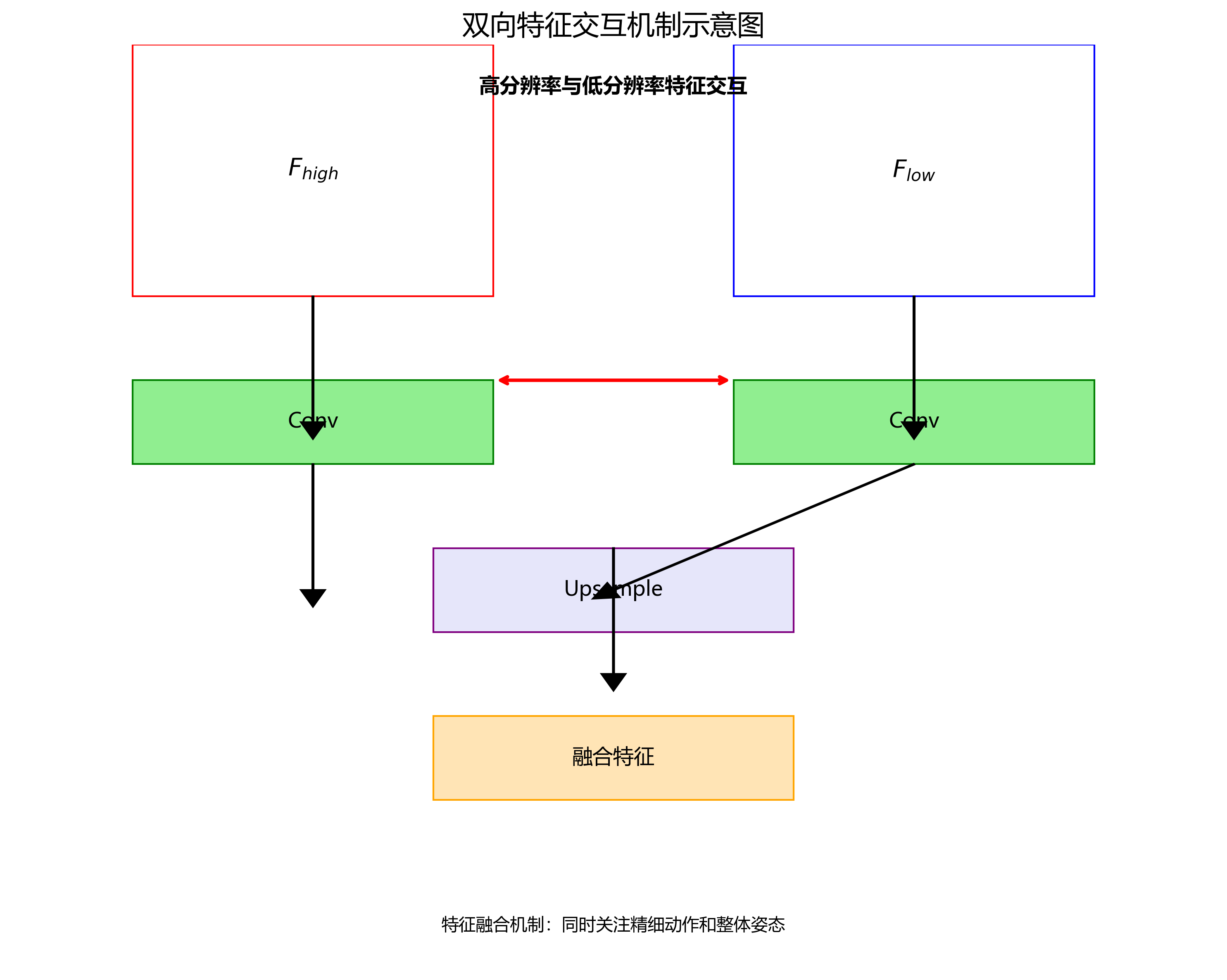 其中,FhighF_{high}Fhigh和FlowF_{low}Flow分别表示高分辨率和低分辨率特征图,Conv表示卷积操作,Upsample表示上采样操作。这种双向特征交互机制确保了不同分辨率特征之间的信息互补。在实际应用中,这种特征融合机制使得网络能够同时关注工人的精细动作和整体姿态,为后续的安全装备检测和违规行为识别提供了丰富的特征表示。