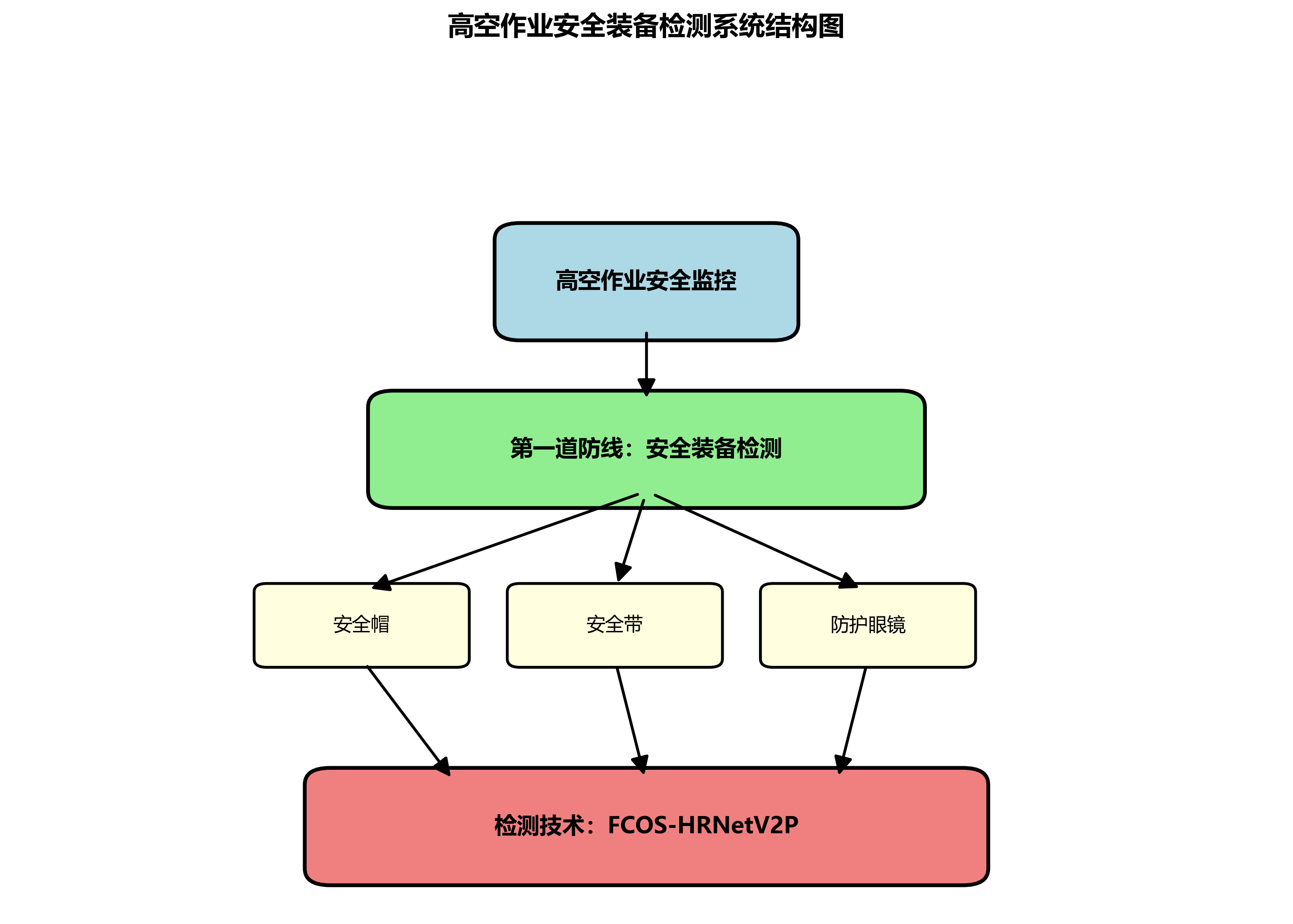 高空作业安全一直是工业生产中的重要环节,传统的人工监管方式存在效率低、易疲劳、主观性强等问题。随着计算机视觉技术的发展,利用深度学习算法实现高空作业安全装备的自动检测和违规行为的智能识别已成为可能。本文将介绍一种基于FCOS-HRNetV2P的高空作业安全装备检测与违规行为识别系统,该系统能够实时检测高空作业人员是否佩戴安全帽、安全带等安全装备,并识别违规攀爬、未系安全带等危险行为,有效提升高空作业安全管理水平。