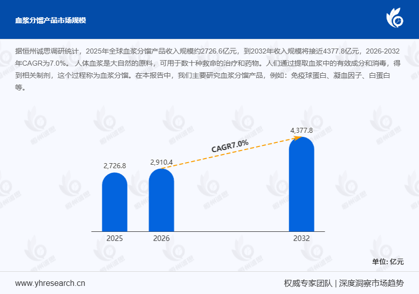 在全球慢性疾病患病率攀升、人口老龄化加速及医疗支出持续增长的背景下,血浆分馏产品作为治疗免疫缺陷、血友病等重症的核心生物制剂,正迎来结构性增长机遇。据恒州诚思调研统计,2025年全球血浆分馏产品市场规模达2726.6亿元,预计至2032年将增至4377.8亿元,2026-2032年复合增长率(CAGR)为7.0%。这一增长背后,是血浆衍生疗法从罕见病治疗向慢性病管理领域的渗透,以及新兴市场医疗可及性提升带来的需求释放。