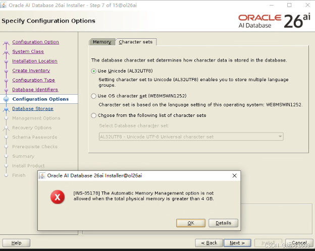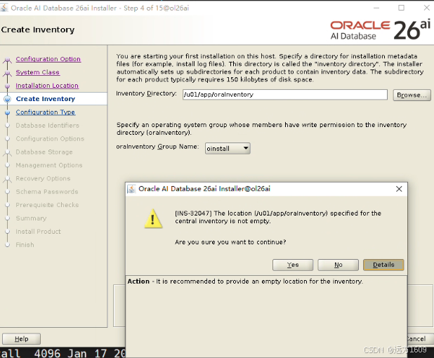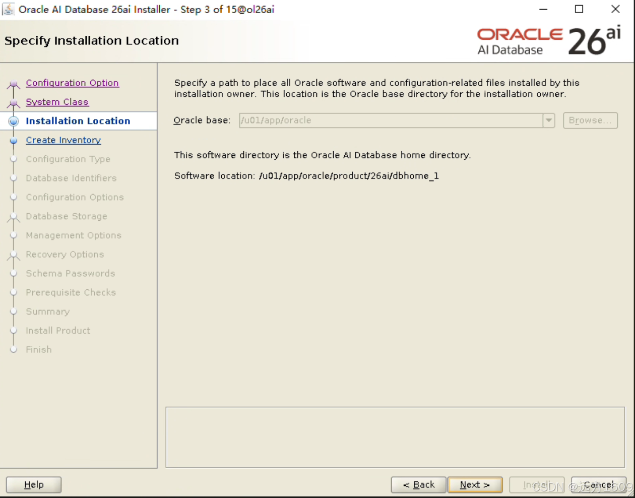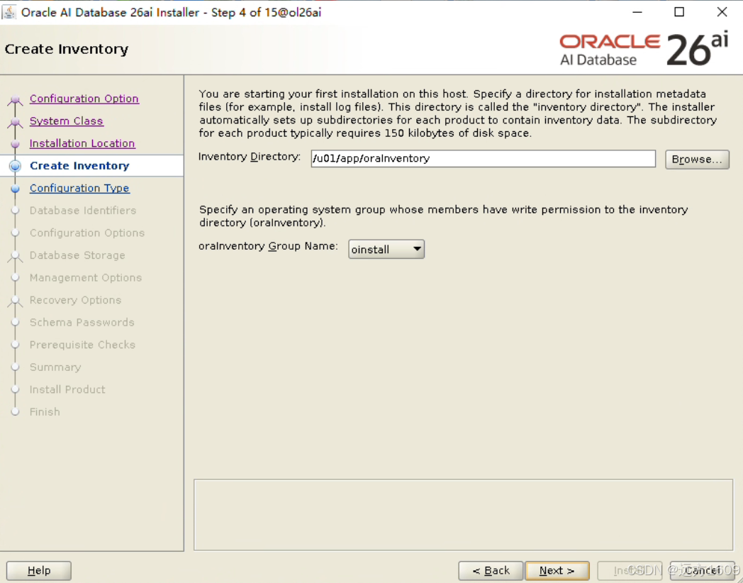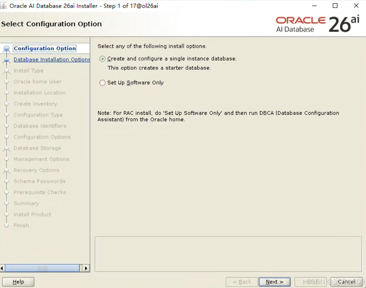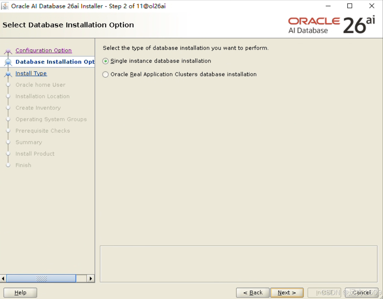 oracle@ol26ai software\]$ ./runInstaller Launching Oracle AI Database Setup Wizard... The response file for this session can be found at: /u01/app/software/install/response/db_2026-02-01_05-16-40PM.rsp You can find the log of this install session at: /tmp/InstallActions2026-02-01_05-16-40PM/installActions2026-02-01_05-16-40PM.log Moved the install session logs to: /u01/app/oraInventory/logs/InstallActions2026-02-01_05-16-40PM