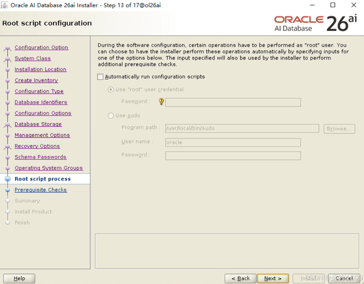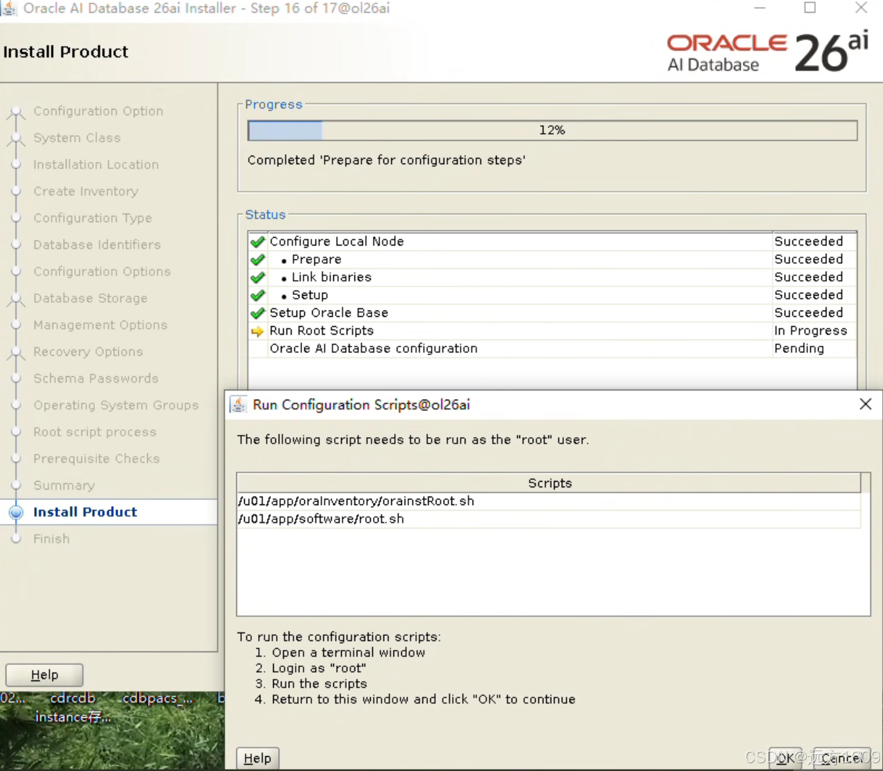 第一个脚本 sudo /u01/app/oraInventory/orainstRoot.sh # 第二个脚本 sudo /u01/app/oracle/product/26ai/dbhome_1/root.sh