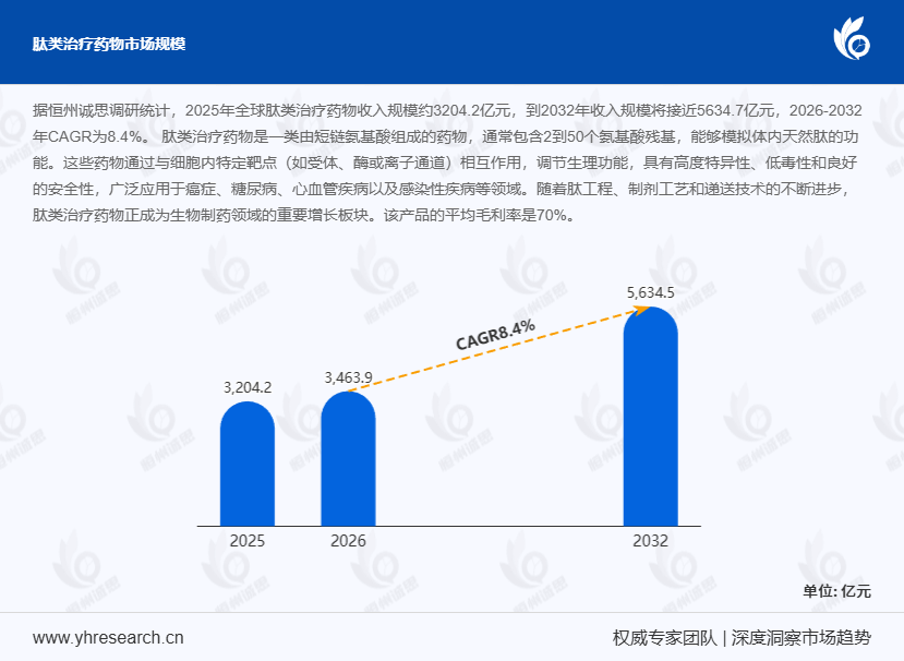 在全球慢性病与罕见病治疗需求激增、生物技术创新加速的背景下,肽类治疗药物凭借其高特异性、低毒性及良好的安全性,正成为生物制药领域最具潜力的细分赛道。据恒州诚思调研统计,2025年全球肽类治疗药物市场规模达3204.2亿元,预计至2032年将增至5634.7亿元,2026-2032年复合增长率(CAGR)为8.4%,远超全球生物药市场整体增速(5.2%)。这一增长背后,是肽工程、递送技术及制剂工艺的突破性进展,推动其从"小众疗法"向"主流治疗手段"跃迁。