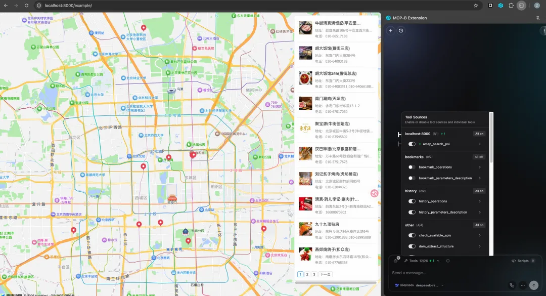 在支持WebMCP的浏览器中打开网页,即可在对话框中调用amap_search_poi工具。