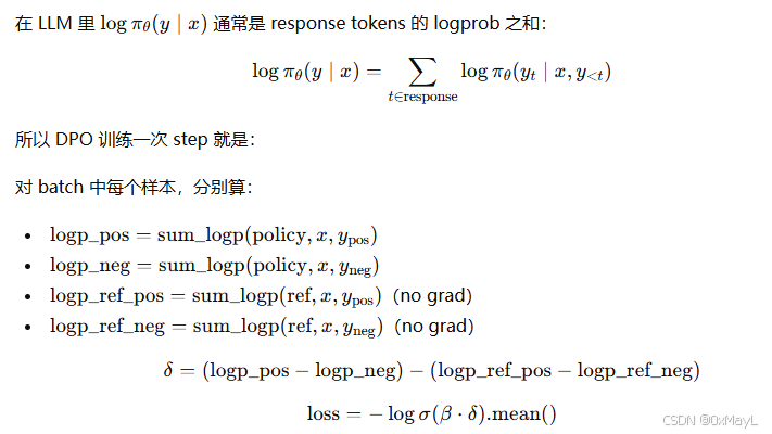 这一步就是 DPO 的核心:不显式训练 reward model,而是用 policy 的 logprob(相对 ref 的差)