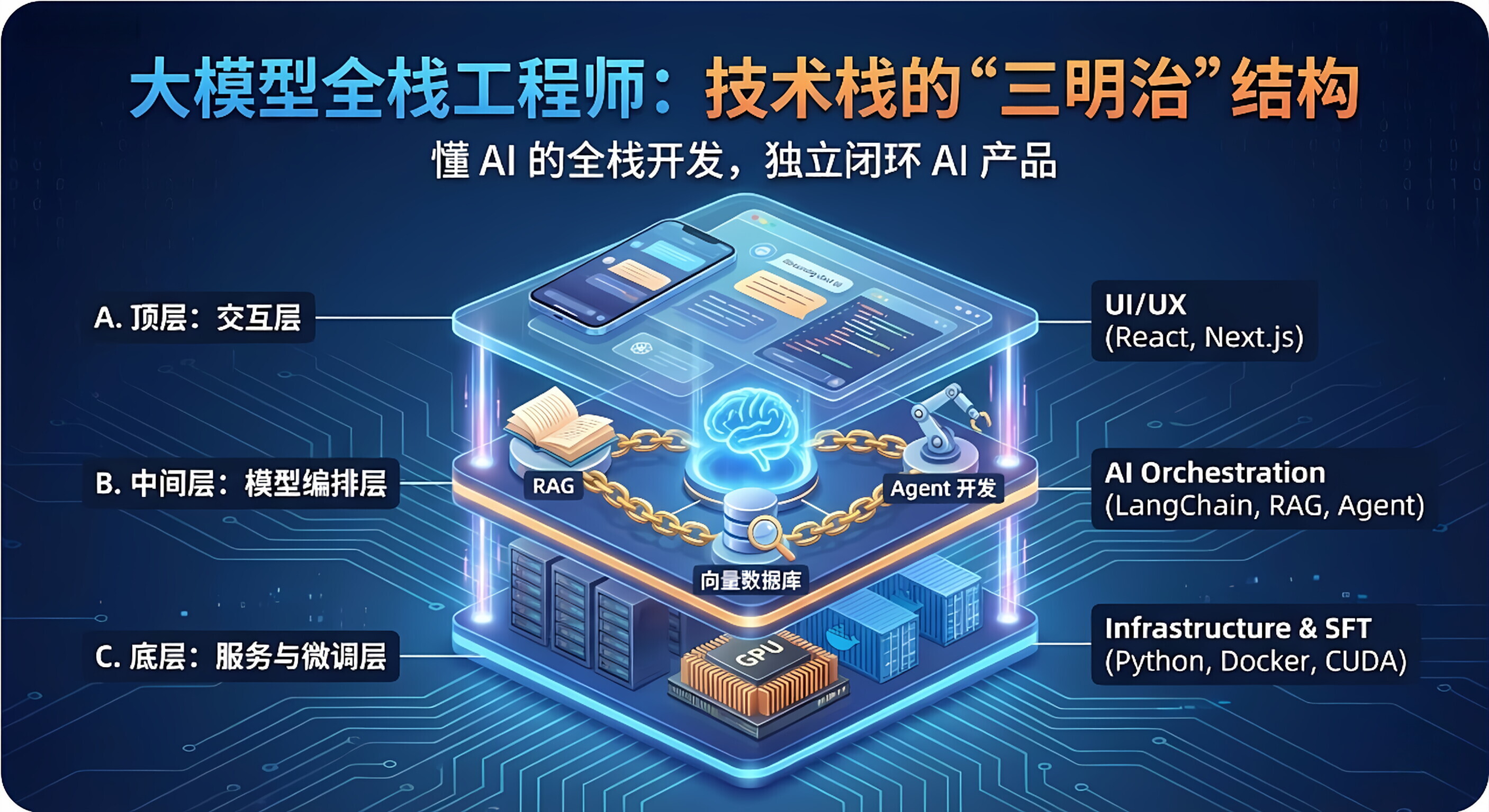 如果说传统的全栈工程师是**"前端 + 后端 + 运维"** ,那么大模型全栈工程师的技能树就是:"前端 + 后端 + AI 模型应用" 。