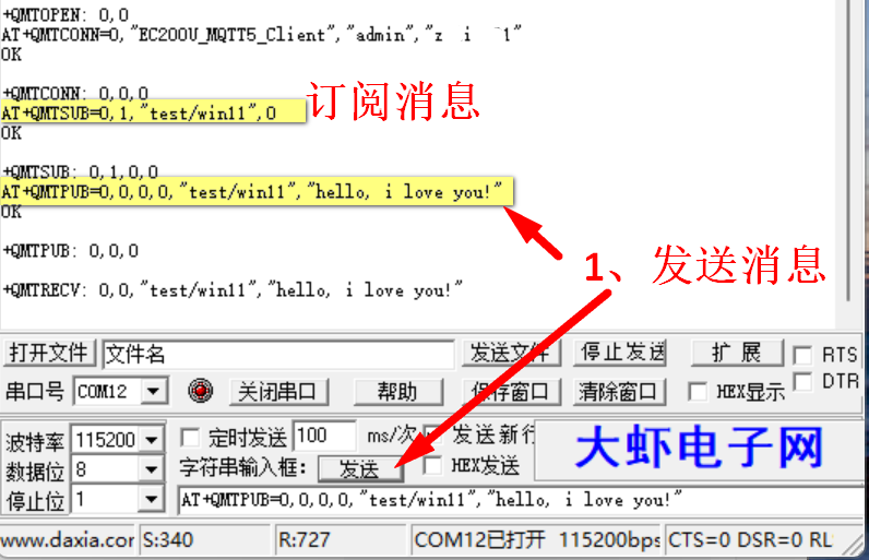 | 12 | AT+QMTPUB=0,0,0,0,"test/win11","hello, i love you!" |