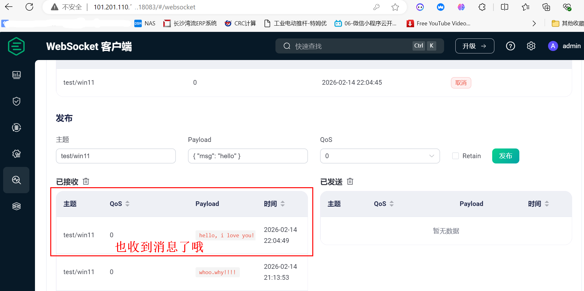 再看看webSocket客户端,也收到消息了哦。这是因为这两个客户端都订阅了"test/win11"主题消息。