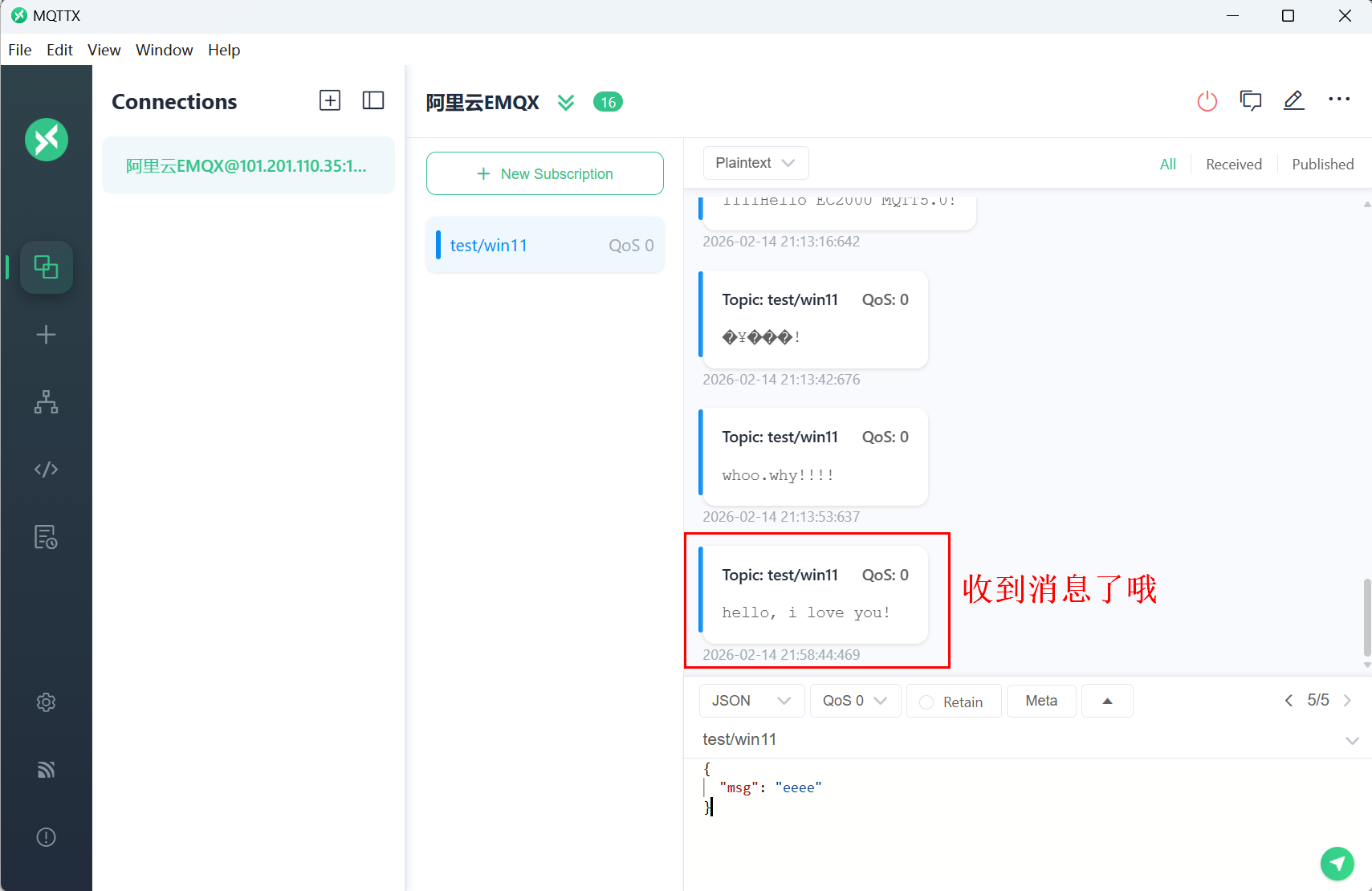 我们再看看MQTTX客户端,也收到消息了哦。