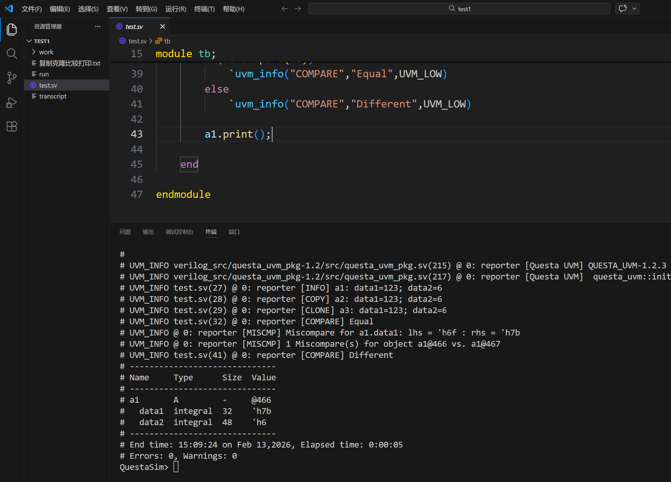 module tb;// initial块:SystemVerilog的初始化块,仿真开始时执行(仅执行一次) initial begin // 声明三个类A的对象句柄(仅声明,未分配内存) A a1,a2,a3; // 1. 创建UVM对象:通过type_id::create()方法(UVM推荐方式) // 相比直接new(),create()支持工厂模式,便于后续重载/替换类 a1 = A::type_id::create("a1"); // 创建对象a1,命名为"a1" a2 = A::type_id::create("a1"); // 注意:a2命名也为"a1"(名称重复不影响功能,仅调试时易混淆) // 2. 带内联约束的随机化: // randomize() with {} 为内联约束,优先级高于类内约束(本例类内无约束) // assert检查随机化是否成功:成功返回1,失败返回0(触发assert报错) assert(a1.randomize() with { data1 == 123; data2<10;}); // 3. copy方法:将a1的所有注册字段值浅拷贝到a2 // 浅拷贝:对于基本类型(int/bit),直接复制值;对于对象句柄,仅复制句柄(指向同一对象) a2.copy(a1); // 4. clone方法:克隆a1(深拷贝),返回uvm_object类型的句柄 // $cast:将父类句柄(uvm_object)向下转换为子类句柄(A),确保类型匹配 $cast(a3,a1.clone()); // 打印a1的数值:UVM_INFO宏(优先级UVM_LOW,默认打印) // $sformatf:格式化字符串,输出data1和data2的十进制值 `uvm_info("INFO", $sformatf("a1: data1=%0d; data2=%0d",a1.data1,a1.data2), UVM_LOW) // 打印copy后的a2数值,验证拷贝是否成功 `uvm_info("COPY", $sformatf("a2: data1=%0d; data2=%0d",a2.data1,a2.data2), UVM_LOW) // 打印clone后的a3数值,验证克隆是否成功 `uvm_info("CLONE", $sformatf("a3: data1=%0d; data2=%0d",a3.data1,a3.data2), UVM_LOW) // 5. compare方法:比较a2和a1的所有注册字段值是否完全一致 // 一致返回1,不一致返回0 if(a2.compare(a1)) `uvm_info("COMPARE","a2 and a1 are Equal",UVM_LOW) else `uvm_info("COMPARE","a2 and a1 are Different",UVM_LOW) // 修改a2的data1值,破坏与a1的一致性 a2.data1 = 111; // 再次比较a2和a1,验证修改后是否不一致 if(a2.compare(a1)) `uvm_info("COMPARE","a2 and a1 are Equal",UVM_LOW) else `uvm_info("COMPARE","a2 and a1 are Different",UVM_LOW) // 6. print方法:打印a1的所有注册字段的详细信息(层次化、类型、值) // 依赖`uvm_field_int`注册的字段,自动输出格式规整的信息 a1.print(); endendmodule
