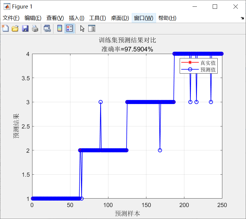 title(['训练集预测结果对比,准确率: ', num2str(train_accuracy * 100), '%']);