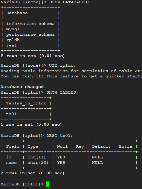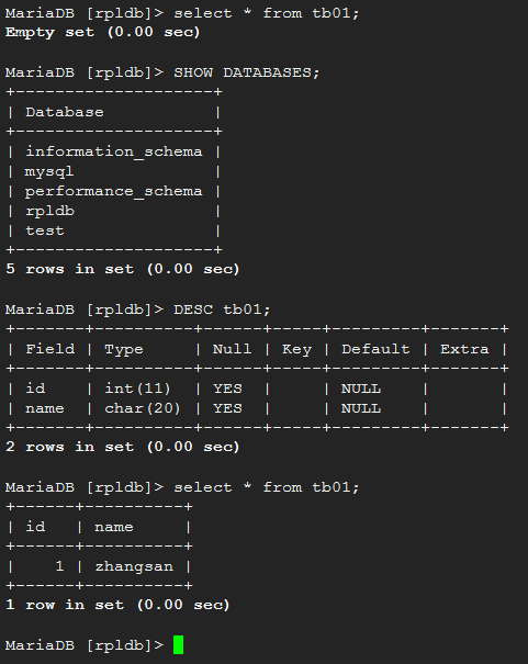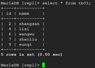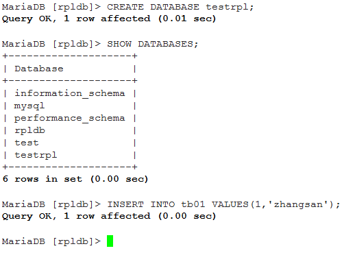 主节点上创建testrpl数据库,没有复制到从节点,指定复制的rpldb,主节点上在其中的tb01表插入数据,在从节点数据被复制了。实现了过滤器复制。