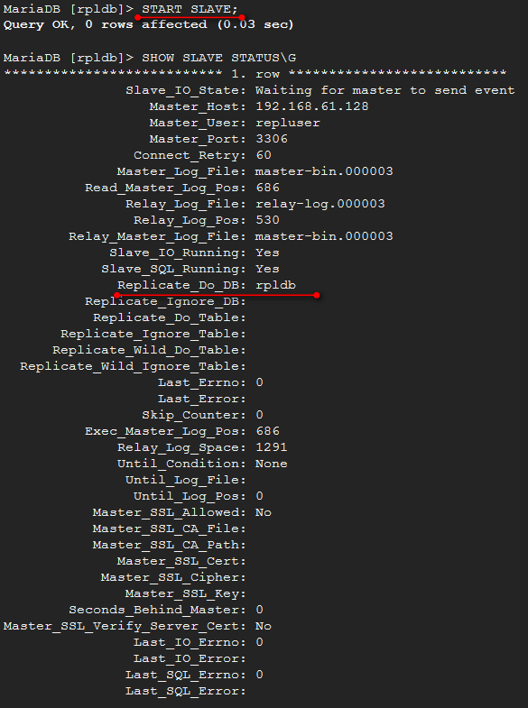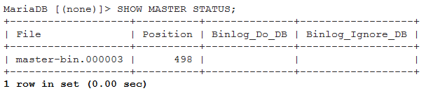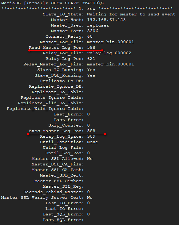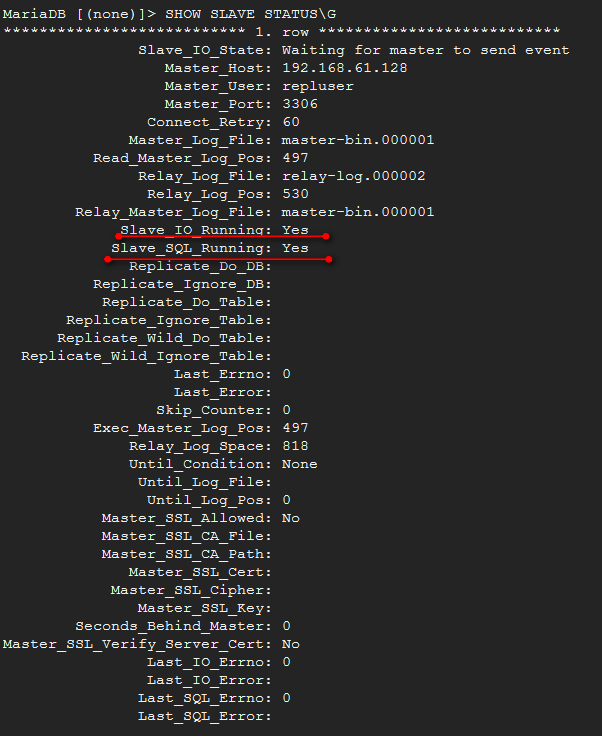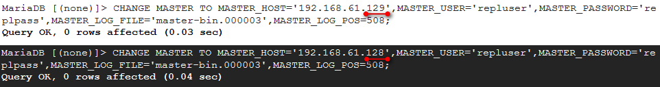 从节点: CHANGE MASTER TO MASTER_HOST='192.168.61.128',MASTER_USER='repluser',MASTER_PASSWORD='replpass',MASTER_LOG_FILE='master-bin.000003',MASTER_LOG_POS=498;
