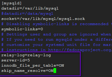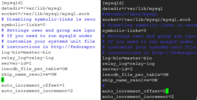 1)修改配置文件,两个节点都启动二进制日志和中继日志,配置server-d及自增id