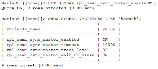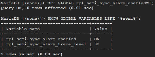 启动半同步复制,主节点rpl_semi_sync_master_enabled设置为ON,从节点rpl_semi_sync_slave_enabled设置为ON