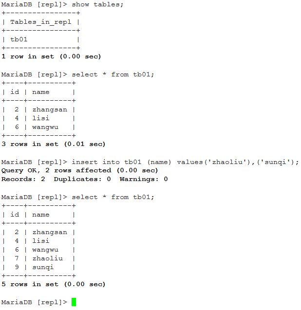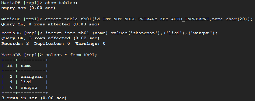 主节点创建数据库和表,插入数据,查看状态变量,查看从节点复制结果: