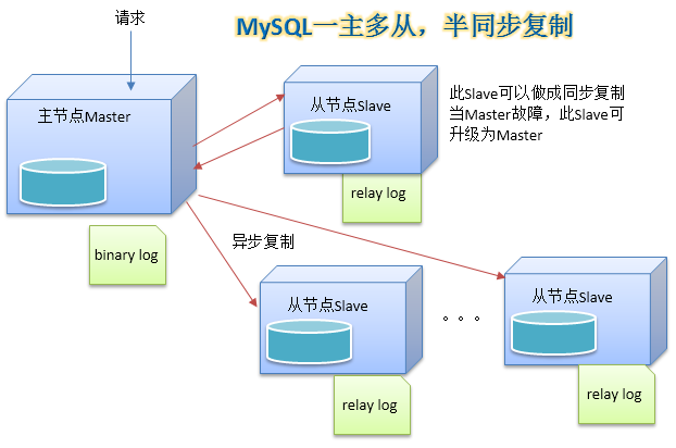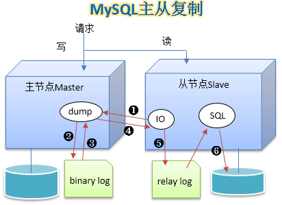 1、异步复制:主节点Dump进程发送events事件给从节点I/O进程,不需要等待从节点返回接收结果;