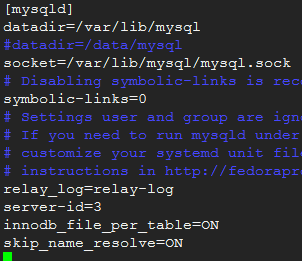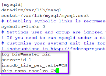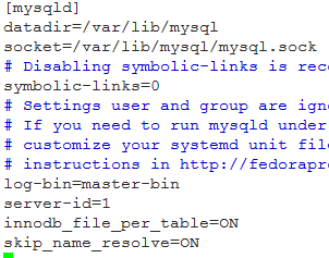 1)配置主配置文件/etc/my.cnf或/etc/my.cnf.d/目录下的server.cnf,配置为主节点:设置启动二进制日志,设置server ID: