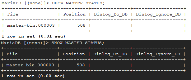 4)查看MASTER STATUS,记住两个节点的二进制日志及其位置: