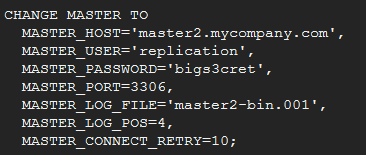 mysql>CHANGE MASTER TO MASTER_HOST='host',MASTER_USER='USER',MASTER_PASSWORD='PASSWORD',MASTER_LOG_FILE='mysql-bin.xxxxxx',MASTER_LOG_POS=###;