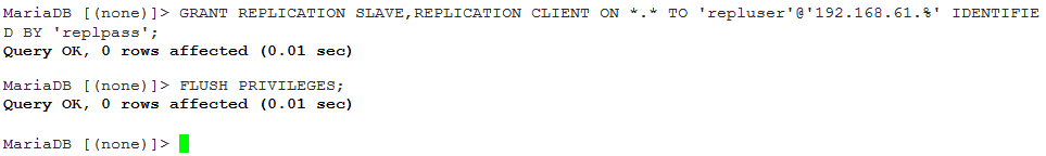 GRANT REPLICATION SLAVE,REPLICATION CLIENT ON *.* TO 'repluser'@'192.168.61.%' IDENTIFIED BY 'replpass';